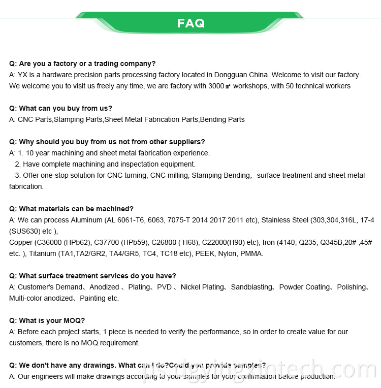 Drawing | Please provide design drawings and contact our sales manager, if there are no drawings can send samples/sample photos to get a free quotation. To help us offer the best service for you. Please be sure your drawings are clear and accurate(including processing,quantity,materials, precision tolerances, surface treatment, and special requirements) | |